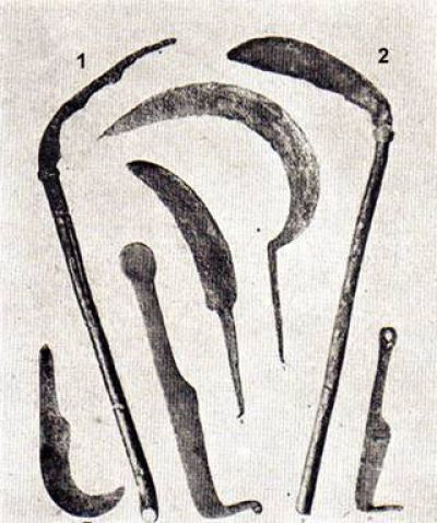 Aus verschiedenen Überlegungen ergibt sich auch sonst mit ziemlicher Sicherheit, dass in den alten Kulturen des Ostens die Sense unbekannt war und als Erntewerkzeug bloß SICHELN verwendet wurden.