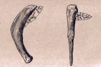 Die eine Form bestand aus einem geraden Holzstab mit einer rechtwinkelig eingesetzten und weit hervorragenden Feuersteinklinge, welche in Schweizer Pfahlbauten gefunden wurde. Die zweite Form bestand aus einem gekrümmten Holzstück, an dessen konkaver Seite eine Rinne eingeschnitten und darin ein Feuersteinsplitter der Länge nach eingekittet war.
